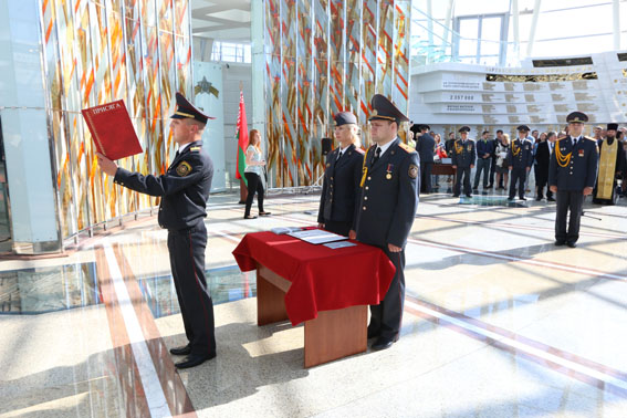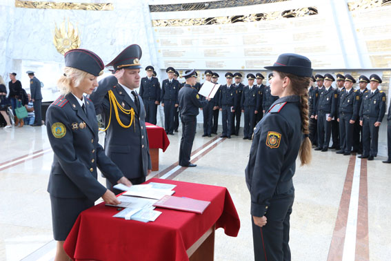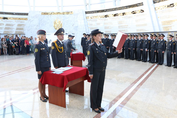 Присягая под сводами величественного Зала Победы, сотрудники внутренних дел поклялись свято соблюдать Конституцию и законы Республики Беларусь, быть честными, мужественными, бдительными при исполнении служебного долга, строго хранить государственную и служебную тайну, не щадя своей жизни, охранять права, свободы и законные интересы граждан, общества и государства от преступных и иных противоправных посягательств.