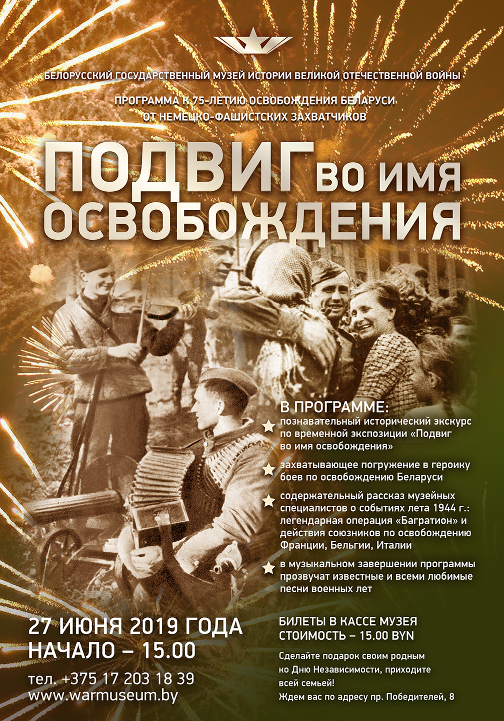 Программа начнется с костюмированной экскурсии по новой временной экспозиции с одноименным названием. Во время познавательного исторического экскурса посетителей ждет захватывающее погружение в героику боев по освобождению Беларуси. Перед ними предстанут горячие события лета 1944 г.: с одной стороны, крупномасштабное наступление в Беларуси в ходе легендарной операции «Багратион», а с другой – действия союзников по освобождению Франции, Бельгии, Италии.