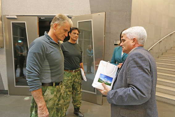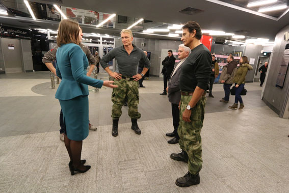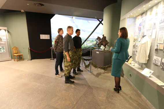 Известного зарубежного киноартиста в ходе экскурсии по музею сопровождали: заместитель директора Белорусского государственного музея истории Великой Отечественной войны Юрий Николаевич Цыкал и бывший начальник государственного учреждения «Военное информационное агентство Вооруженных Сил Республики Беларусь "ВАЯР"» полковник запаса Андрей Юрьевич Шубадеров.