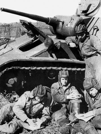 Наш танковый батальон был укомплектован легкими танками Т‑70, а 1‑й батальон — средними Т‑34. Слева наступала 25‑я танковая бригада, укомплектованная так же, как и наша. Обе эти бригады (31‑я и 25‑я) составляли второй эшелон корпуса. А впереди — 32‑я танковая бригада, полностью укомплектованная танками Т‑34. Ее танки, ведя огневой бой с наступающими навстречу танками противника, уничтожали их огнем, многие шли на таран. Таким же методом действовал и противник, углубляясь в наши боевые порядки.