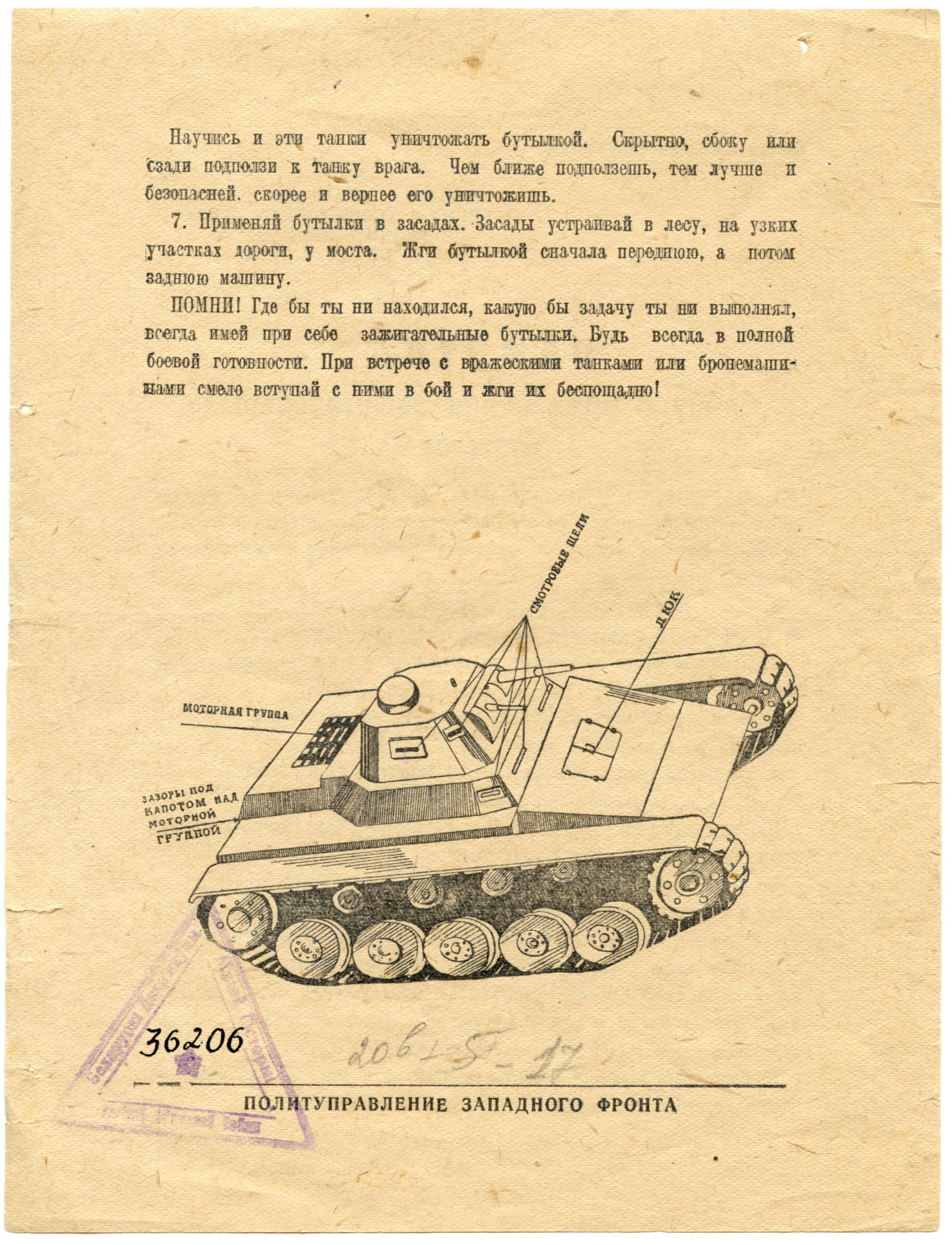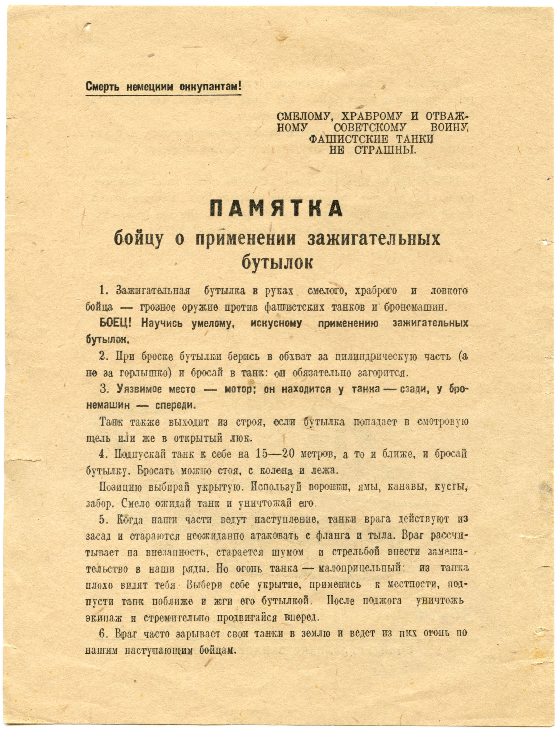 В фондах музея находится еще один важный документ минувшей войны – выцветшая от времени «Памятка бойцу о применении зажигательных бутылок», подготовленная политуправлением Западного фронта. В памятке содержатся конкретные рекомендации воинам: «подпускай танк к себе на 15-20 метров, а то и ближе, и бросай бытылку. Используй воронки, ямы, канавы, кусты, забор. Смело ожидай танк и уничтожай его». Здесь же помещен рисунок вражеского танка с указанием его уязвимых мест, а также описаны способы бросков бутылок и устройства засад против танков. Такие памятки из фондов музея до сих пор хранят запах бензина и пороховой гари, их держали в руках бойцы генерала Руссиянова и других соединений, по ним они учились беспощадно уничтожать танки врага.