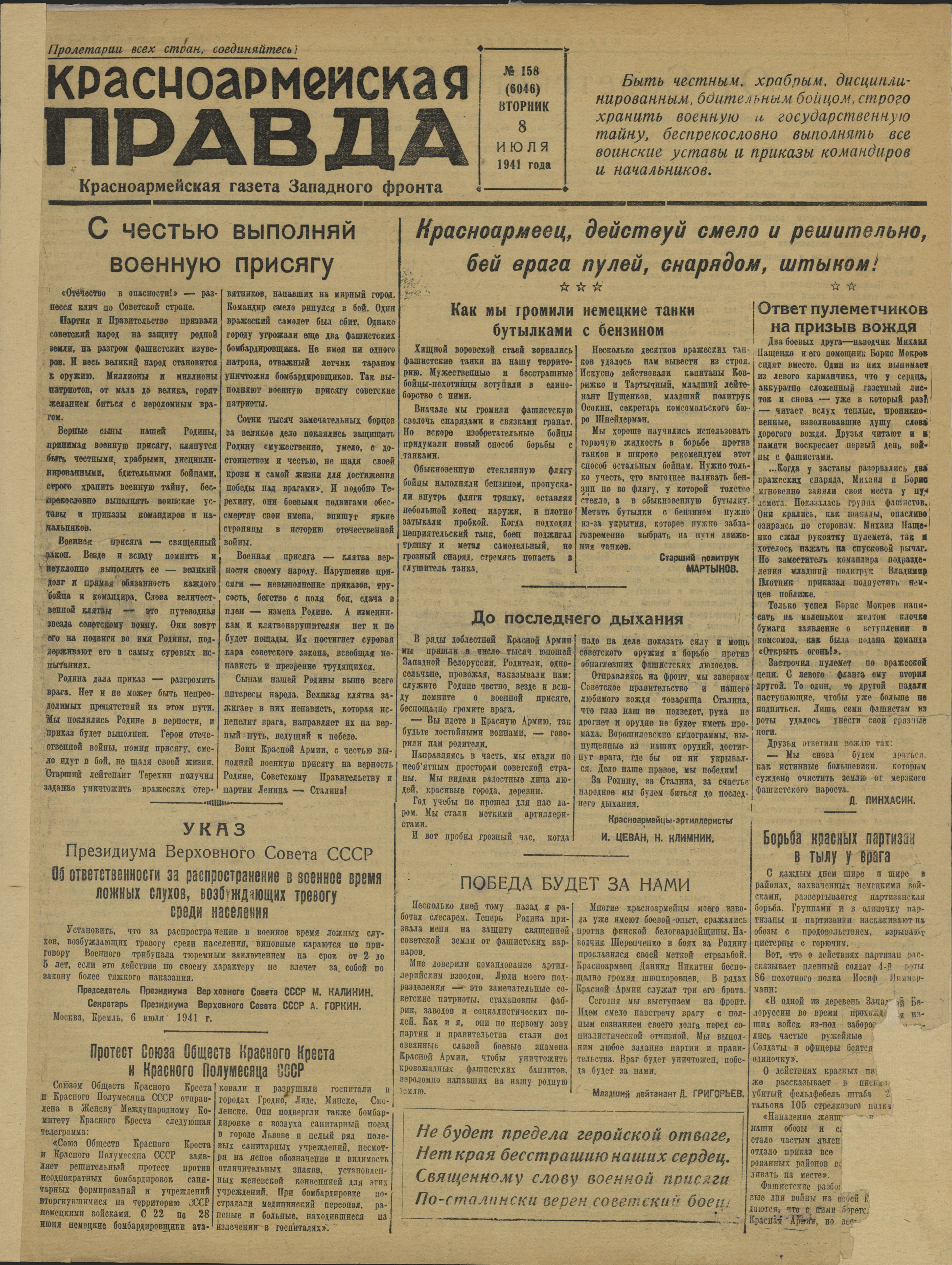 С трепетом в душе и особым чувством гордости за защитников Минска беру в руки газету Западного фронта «Красноармейская правда» за субботу 9 августа 1941 г., бережно хранящуюся в фондах Белорусского государственного музея истории Великой Отечественной войны. Целых две страницы газеты выпущены с материалами под заголовком «100-я ордена Ленина дивизия в боях с врагами Родины». В статьях «Наводчик Иван Кавун», «Пять смельчаков», «Героический полк» и других фронтовые корреспонденты знакомят военных читателей с героизмом красноармейцев и командиров соединения. Вот газетная заметка А. Власова «Истребители танков». В ней указывается, что «по инициативе капитана Коврижко против вражеских танков впервые была применена бутылка с бензином. Капитан обучил своих бойцов применять в бою это грозное оружие. Этот простой снаряд бойцы применяли очень умело. В первом же бою подразделение капитана Коврижко вывело из строя 16 немецких танков. Сам капитан в течение дня поджег около десяти танков. Этот ценный опыт борьбы быстро переняли бойцы и командиры всей дивизии. В одном из боев сладший лейтенант Геущенков поджег три танка. Секретарь комсомольского бюро Шнейдерман вместе с политруком Осокиным сожгли два танка».