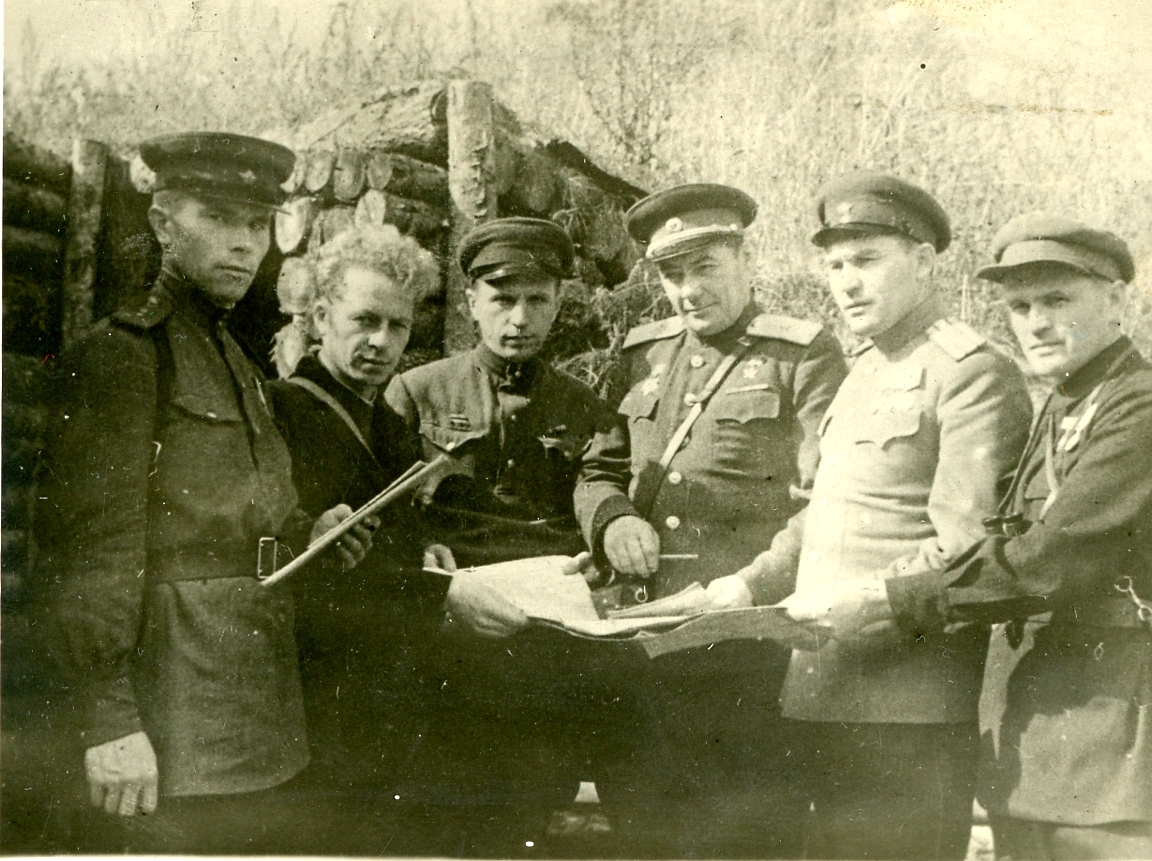 Генерал-майор В.И. Козлов (3-й справа) с работниками штаба партизанского соединения Минской области. 1944 г.