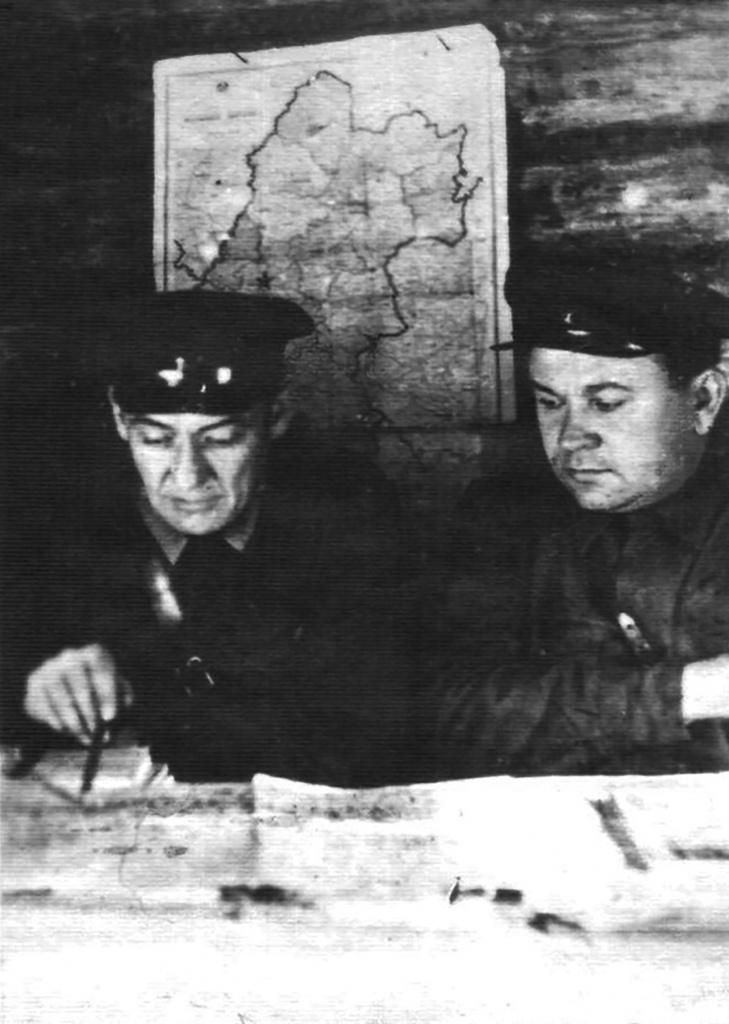 Первый секретарь Минского подпольного обкома КП(б)Б, командир Минского партизанского соединения В.И. Козлов (слева) и секретарь Минского подпольного обкома КП(б)Б И.А. Бельский в штабной землянке за разработкой плана боевой операции. 1943 г.