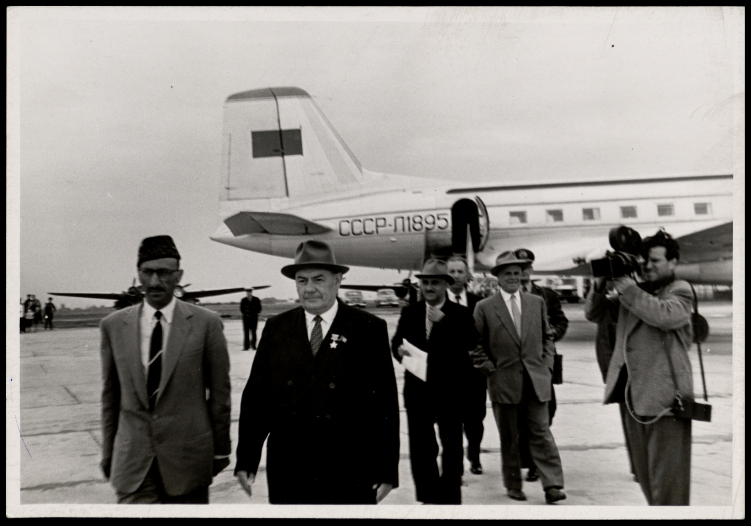 Председатель Президиума Верховного Совета БССР В.И. Козлов встречает в минском аэропорту короля Афганистана Мухаммеда Захир-шаха. 1957 г.
