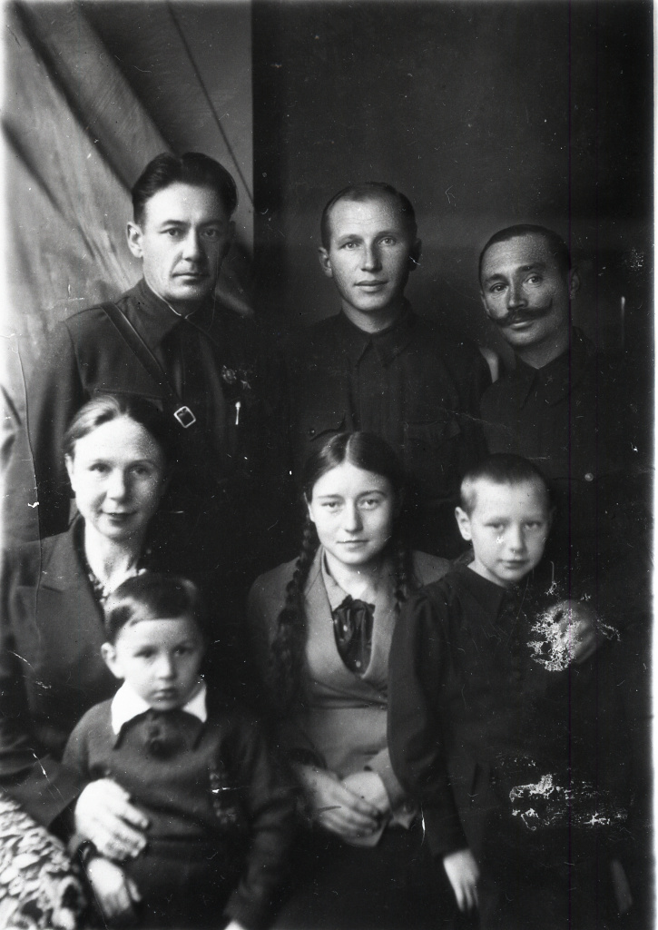 Первый секретарь Минского подпольного обкома КП(б)Б В.И. Козлов (слева), член Минского подпольного обкома КП(б)Б А.Г. Бондарь (в центре), заместитель командира Минского партизанского соединения М.П. Константинов, жена и дочери В.И. Козлова Ольга и Тамара. Москва, 1942 г.