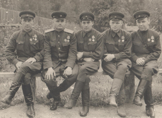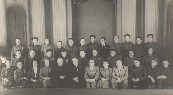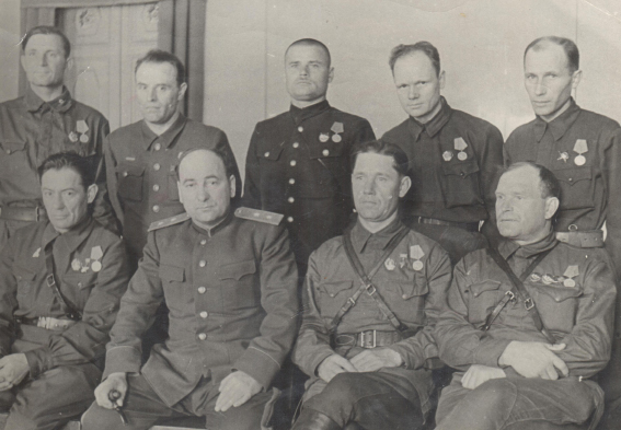 ![]() Награждённые орденами и медалями Советского Союза в Кремле. Второй ряд слева направо: 3-ий – Варвашеня И.Д., 4-ый – Герой Советского Союза Лобанок В.Е., 6-ой – Герой Советского Союза Павловский Ф.И., награждённый орденом Красной Звезды. Август 1943 г. |