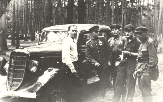 Партизаны бригады № 123 имени 25-летия БССР Полесской области. Слева направо: шофёр бригады, командир бригады Павловский Ф.И., начальник штаба бригады Барьяш Г.И., художник бригады, Секретарь Октябрьского подпольного РК КП(б)Б и комиссар бригады Татаров Е.А. 1944 г. |