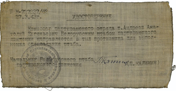 Удостоверение на ткани А.Е. Андреева