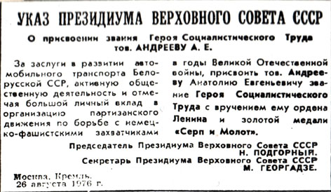 За заслуги в развитии автомобильного транспорта Белорусской ССР, активную общественную деятельность и большой личный вклад в организацию партизанского движения в годы Великой Отечественной войны Андрееву Анатолию Евгеньевичу Указом Президиума Верховного Совета СССР от 26 августа 1976 г. присвоено звание Героя Социалистического Труда.