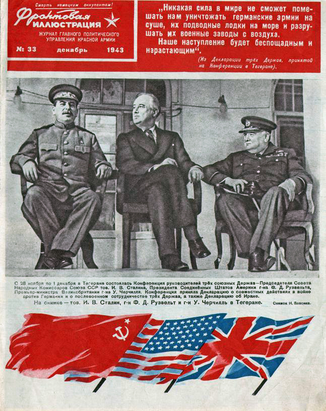| Заглаўная старонка з часопіса Галоўнага палітычнага ўпраўлення Чырвонай Арміі, прысвечаная Тэгеранскай канферэнцыі |