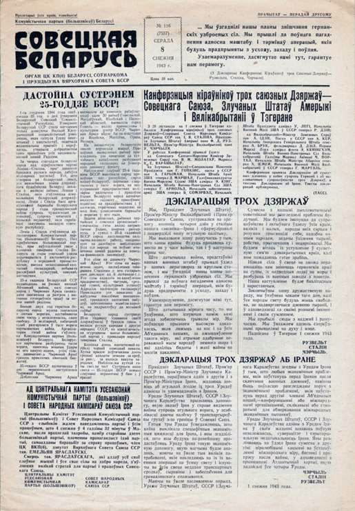 28 лістапада 2018 г. спаўняецца 75 год з пачатку сустрэчы кіраўнікоў краін антыгітлераўскай кааліцыі ў Тэгеране, вядомай таксама як канферэнцыя “Вялікай тройкі”. Гэта падзея сыграла вялікую ролю ва ўмацаванні кааліцыі, вырашыла важныя надзённыя пытанні, стала пэўным крокам для далейшага ўтварэння Арганізацыі Аб’яднаных Нацый. Важную ролю тут таксама cыграла Маскоўская канферэнцыя міністраў замежных спраў, якая праходзіла 19-30 кастрычніка 1943 г. Гэта сустрэча стала пэўнай падрыхтоўкай да падзей у Тэгеране.