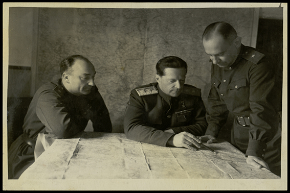 | Командование 1-й воздушной армии во время разработки боевой операции. В центре – командующий армией генерал-лейтенант авиации М.М. Громов. 1943 г |