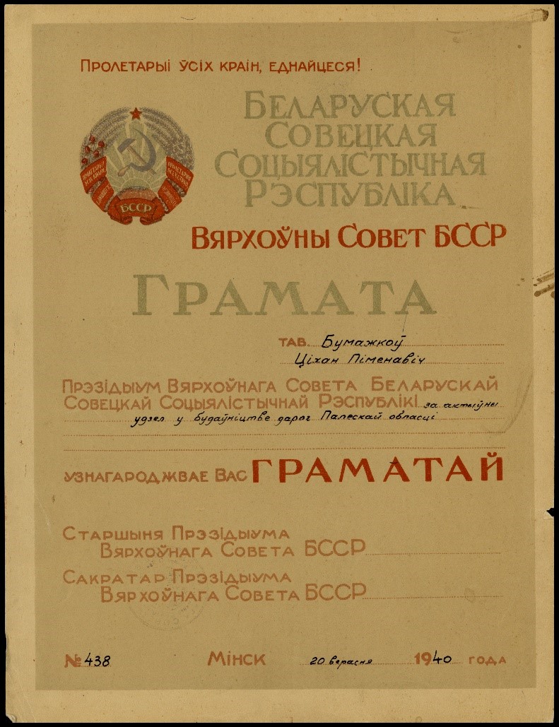 Грамота Герою Советского Союза Бумажкову Т.П. Фонды БГМИВОВ |