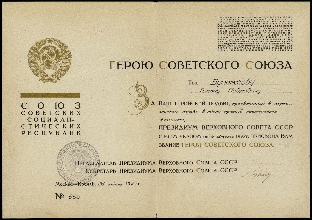 За организацию партизанского отряда и успешные бои против гитлеровских войск Тихон Бумажков и его ближайший соратник Федор Павловский Указом Президиума Верховного Совета СССР от 6 августа 1941 года удостоены звания Героя Советского Союза с вручением ордена Ленина и медали "Золотая Звезда".
