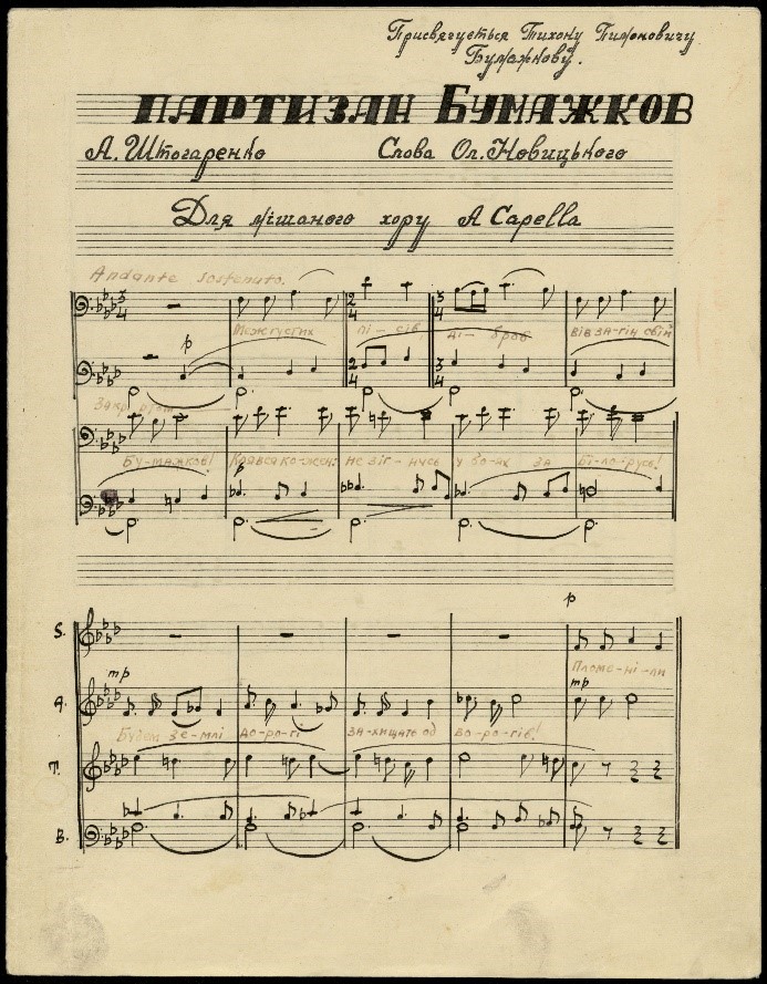 Кантата «Партизан Бумажков», автор текста – О.Новицкий, автор музыки – А. Штогаренко. Фонды БГМИВОВ |