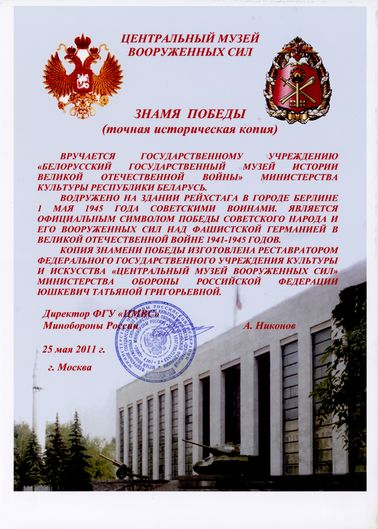 Помощник директора музея Николай Дмитриевич Шевченко с особым воодушевлением и волнением зачитал ветерану и его родственникам текст сертификата, выложенного в Зале Победы для всеобщего обозрения, в котором официально засвидетельствован факт вручения музею исторической копии Знамени Победы. «Знамя Победы, – говорится в этом документе, – штурмовой флаг 150-й ордена Кутузова II степени Идрицкой стрелковой дивизии, водруженный 1 мая 1945 г. над зданием рейхстага в Берлине советскими воинами Алексеем Берестом, Михаилом Егоровым и Мелитоном Кантария. Знамя Победы является официальным символом победы советского народа и его Вооруженных Сил над нацистской Германией в Великой Отечественной войне 1941-1945 годов. Копия Знамени Победы изготовлена реставратором Федерального государственного учреждения культуры и искусства «Центральный музей Вооруженных Сил» Министерства обороны Российской Федерации Юшкевич Татьяной Григорьевной».