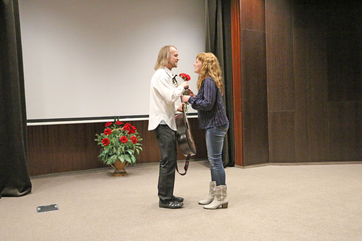 Зрители вручили артисту – исполнителю песен Высоцкого – цветы.