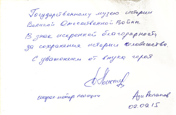 Внук героя передал музею с дарственной надписью хроникально-документальную книгу, посвященную 100-летнему юбилею доблестного сына азербайджанского народа, дважды Герою Советского Союза Ази Ахат Оглы Асланову. В предисловии к книге Президент Азербайджанской Республики Ильхам Алиев отмечает: «В 1941–1945 гг. почти 700 тысяч азербайджанцев отправились на передовую и мужественно сражались с жестоким врагом. Половина их пала смертью храбрых на полях сражений». Памятное издание в Зале Победы с благодарностью принял директор музея генерал-майор запаса Николай Скобелев.