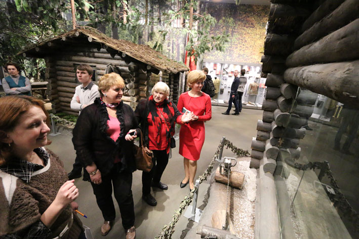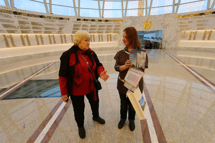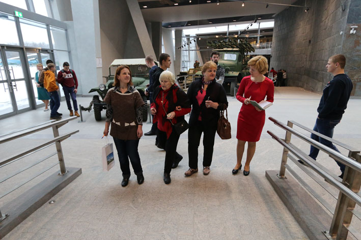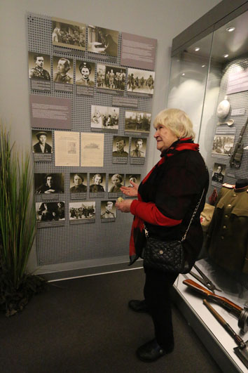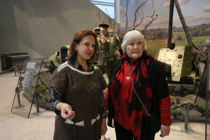 Очень сильное впечатление на Галину Павловну произвели инсталляции в зале «Дорога войны», объёмно-пространственные композиции в зале, посвящённом истории партизанского движения и подпольной борьбы. Ветеран надолго задержалсь у фотографии Героя Советского Союза В.С. Гризодубовой, которая в годы войны командовала 101-м авиаполком Авиации дальнего действия, совершавшим вылеты к белорусским партизанам. Особое внимание в экспозиции зала № 8 привлекли материалы о её родном 125-м гвардейском авиаполке. На стенде Галина Павловна увидела своего командира гвардии подполковника В.В. Маркова, сюжетный снимок, запечатлевший митинг перед началом боевых действий на витебско-оршанском направлении в 1943 г., фотопортреты лётчиц Е.Н. Пономарёвой, Л.М. Губиной, А.М. Язовской, погибших 14 октября 1943 г. под Оршей.