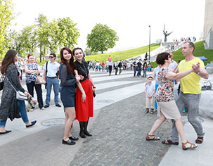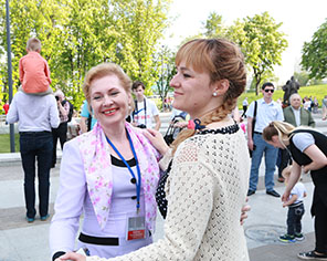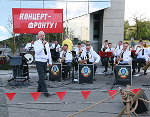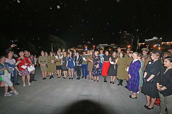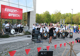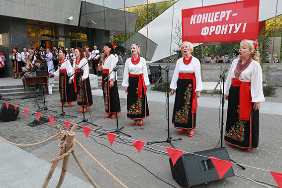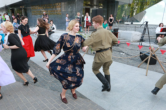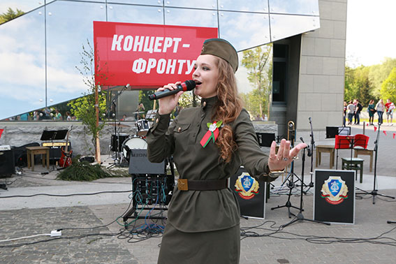 На площадке возле музея было многолюдно: здесь выступала задорная «фронтовая агитбригада “Концерт – фронту!”». В роли фронтовых артистов органично вживались артисты духового оркестра ГУВД Мингорисполкома и творческие коллективы Республиканского центра национальных культур. Рядом со сценой работала танцевальная площадка – неравнодушная публика поддерживала артистов зажигательными танцами. В перерывах между выступлениями коллективов со сцены звучали интересные факты о выступлениях фронтовых бригад в годы Великой Отечественной войны и о роли представителей разных национальностей в освобождении Беларуси.