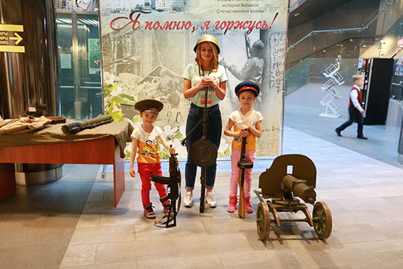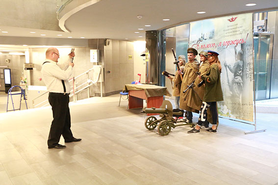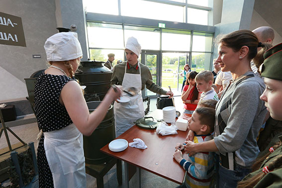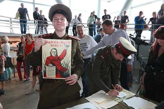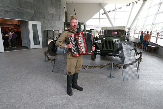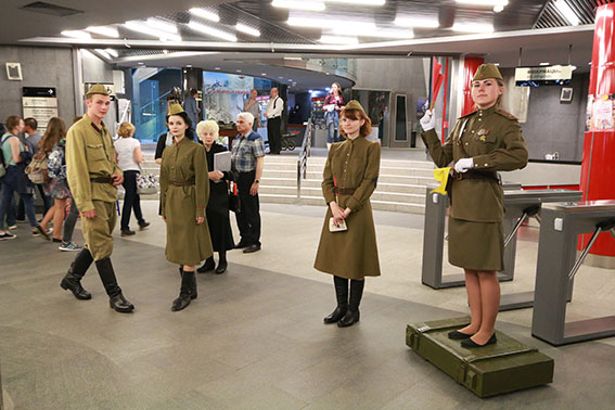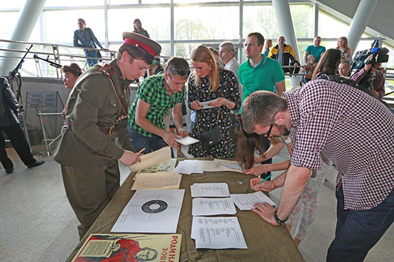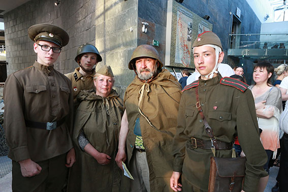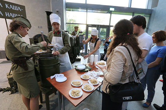 Сотрудники музея в форме военных лет встречали многочисленных посетителей, вручая бесплатные билеты тем, кто пришел в музей в форме бойцов и командиров Красной или Советской Армии, а также в гражданских нарядах предвоенного и послевоенного периодов.