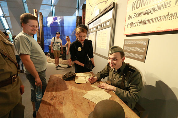 Двигаясь далее по музейному маршруту, посетители могли пройти инструктаж по стрелковому оружию и вступить в добровольцы Красной Армии. Затем они попадали на «оккупированную территорию», где «солдат вермахта» выписывал им личные свидетельства personalausweis, призывая ознакомиться с «новым порядком». В этом же зале «мальчик-чистильщик обуви» предлагал посетителям вычистить их ботинки, взамен вручая листовки с просьбой передать их партизанам. Чтобы пройти в «оккупированный город» гости музея должны были предъявить «патрульному офицеру» свои personalausweis.