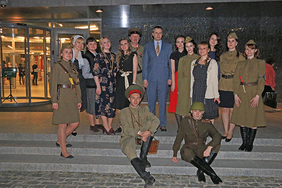 персонажи военных лет – Н.Юрасева, А.Исакова, Е.Дворецкая, Р.Рум, С.Угринович, Н.Тройнель, Е.Романюк, А.Синявский, А.Малец, Е.Пашкевич, М.Кучук, М.Гореликова, Г.Скоринко, И.Захаро, Ю.Кувшинов, В.Мироненко, А.Стаховская, С.Потупчик, Н.Филиппович, Е.Новицкая, Ю.Колтович, Т.Целогуз, А.Иванов, Я.Шевчик, Ю.Хоменков, О. Орловская, О.Епихова, студенты-волонтеры исторического факультета БГУ;