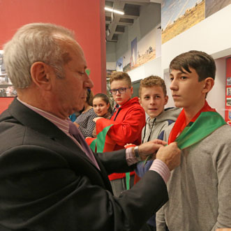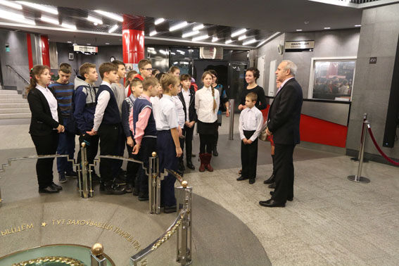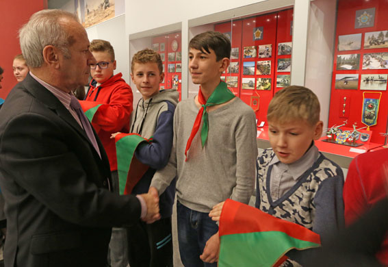 С важным событием в жизни учащихся поздравил ветеран Вооруженных Сил СССР и ВЛКСМ, помощник директора Белорусского государственного музея истории Великой Отечественной войны Николай Дмитриевич Шевченко. «Пионерские галстуки, как и Государственный флаг Республики Беларусь, сочетают в себе красный и зеленый цвет, – сказал он. – Гордо пронеси по жизни это знаменательное событие – прием в пионеры в Белорусском государственном музее истории Великой Отечественной войны. Будьте достойны боевым традициям воинов Красной Армии, партизан и подпольщиков Беларуси, увековеченных в этом святом храме народной памяти! Неукоснительно выполняйте главную цель БРПО: «Каждому пионеру стать настоящим гражданином, своими делами и поступками приносить пользу себе, своей семье, Родине!».