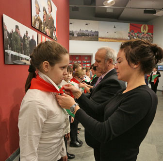 В торжественном ритуале приняли участие помощник директора музея Николай Дмитриевич Шевченко, научный сотрудник Светлана Геннадьевна Угринович, заместитель директора школы по воспитательной работе Елена Григорьевна Сеген, классный руководитель Светлана Николаевна Четырбок. Им предоставлено почетное право повязать школьникам пионерские галстуки – знак принадлежности к пионерской организации, символ сопричастности каждого пионера к делам своего молодежного коллектива, готовности разделить его добрую славу и ответственность.