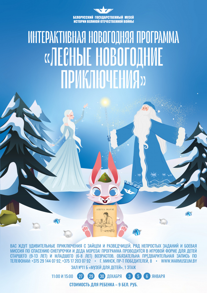В новогодней интерактивной программе «Лесные новогодние приключения» юным посетителям музея предстоит вместе с Зайцем и Разведчицей пройти ряд непростых заданий и успешно выполнить боевую миссию по спасению Снегурочки и Деда Мороза!
