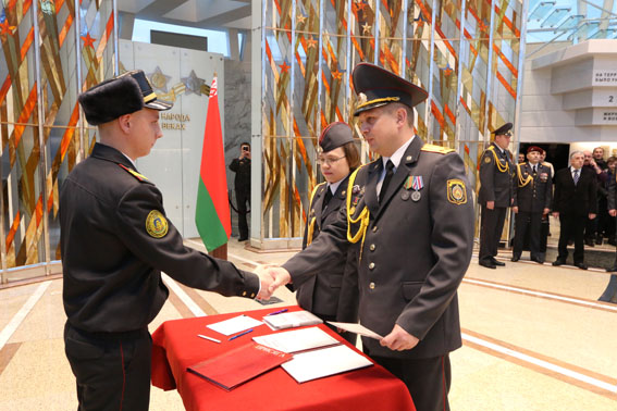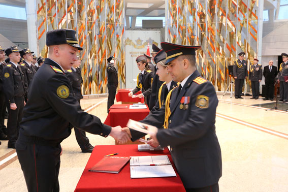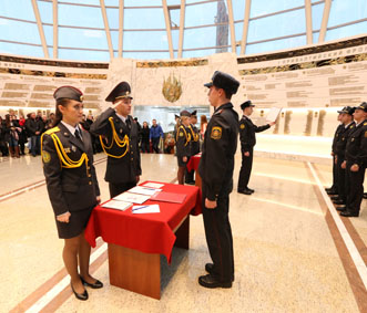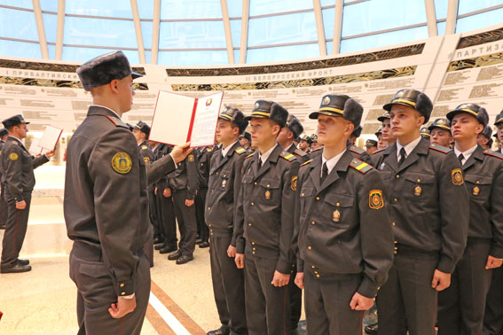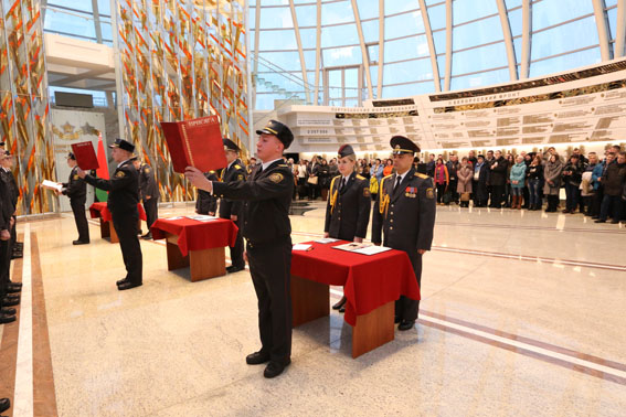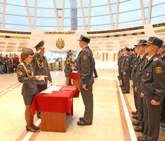 Поздравил молодых милиционеров с этим важным для каждого сотрудника органов внутренних дел событием начальник учреждения образования полковник милиции Игорь Николаевич Оберемко. «Принимая присягу перед своими товарищами, родными и близкими, каждый из вас публично подтверждает свою готовность и стремление честно выполнять служебный долг, клянется верности нашей Отчизне. Сегодня вы взошли на первую, но очень важную ступеньку на пути профессионального становления. Уверен, используя все возможности, вы сможете заложить прочный фундамент своей будущей служебной деятельности», – отметил он, обращаясь к курсантам. Торжественная фраза – «Служу Республике Беларусь!» – должна впредь стать жизненным девизом каждого сотрудника МВД.