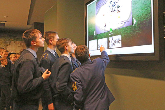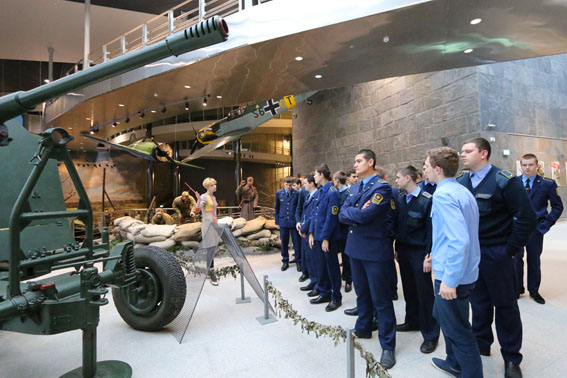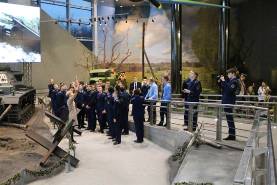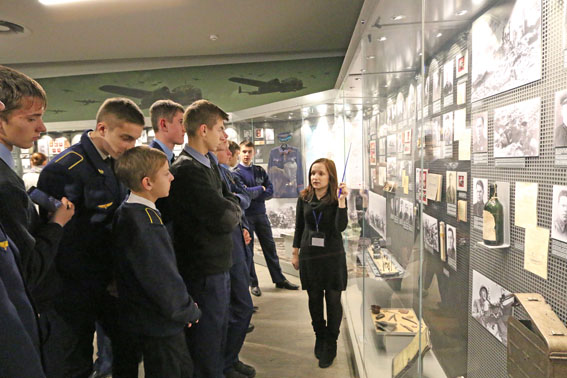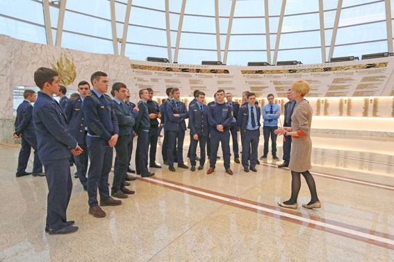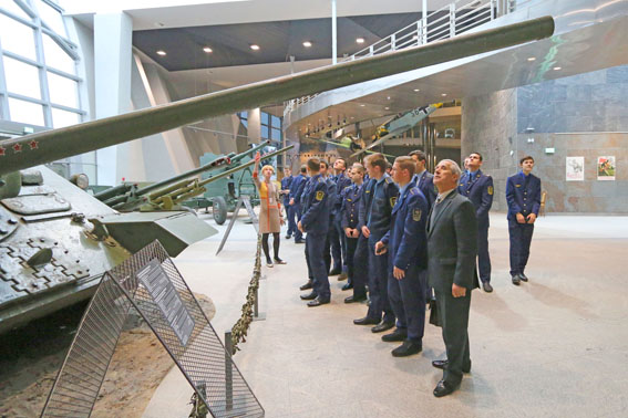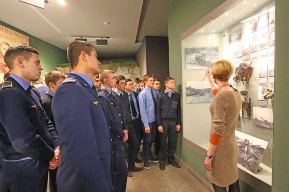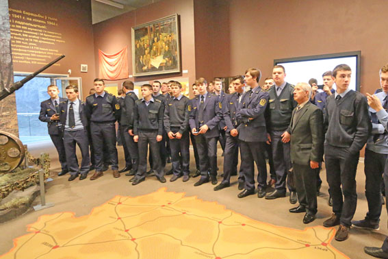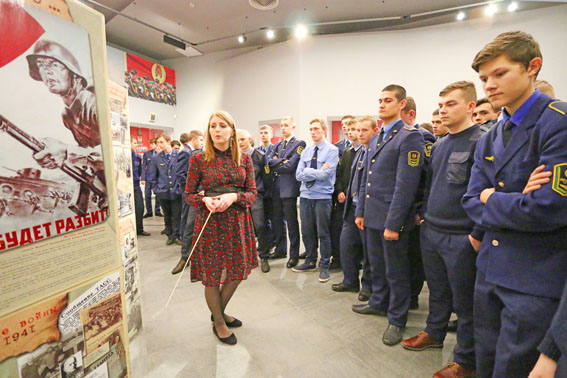 С таким названием в Белорусском государственном музее истории Великой Отечественной войны состоялся патриотический урок, посвященный 74-й годовщине контрнаступлению советских войск под Москвой. Перед началом урока участники мероприятия – члены молодежного клуба «Патриот» при Республиканском Доме ДОСААФ – учащиеся УО «Минский государственный профессионально-технический колледж железнодорожного транспорта им. Е.П. Юшкевича ознакомились с экспозицией музея, раскрывающей основные события битвы под Москвой. Экскурсию по залам музея провели научные сотрудники Екатерина Дубицкая и Ольга Орловская. Особое внимание ребят привлекли: плакат художника Б.А. Мухина «Защитим родную Москву», сюжетные фотографии «Труженики Москвы получают оружие после вступления в народное ополчение», «Жители Москвы на строительстве укреплений. Ноябрь 1941 г.», «Бомбоубежище на станции метро «Площадь Маяковского» во время воздушной тревоги». В витрине представлены личные вещи уроженца Витебской области командира 2-го кавалерийского корпуса Героя Советского Союза генерал-майора Л.М. Доватора – гимнастерка, компас, портфель, полевая книжка-блокнот, линейка. Рядом с витриной скульптура 1954 г. «Герой Советского Союза Л.М. Доватор на лошади», выполненная А.К. Глебовым. В музее экспонируется 25-мм зенитная пушка, какими прикрывали московское небо от налета вражеской авиации. Для ребят показан хроникально-документальный фильм «Военный Парад в Москве 7 ноября 1941 г. – Парад надежды».