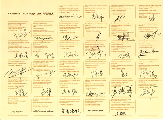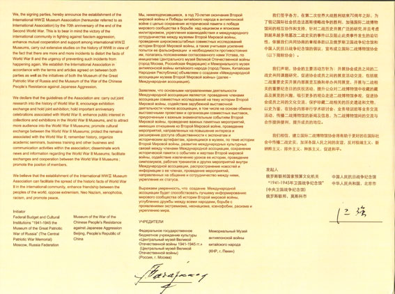 6–9 сентября 2015 г. представители музеев из разных стран мира собрались в Пекине для участия в международной встрече под лозунгом «Помнить историю, бороться за мир!». Федеральное государственное бюджетное учреждение культуры «Центральный музей Великой Отечественной войны 1941–1945 гг.» (г. Москва, Россия) и Мемориальный музей антияпонской борьбы китайского народа (г. Пекин, КНР) совместно внесли предложение о создании международной организации по развитию и укреплению сотрудничества между музеями Второй мировой войны всех стран мира.
