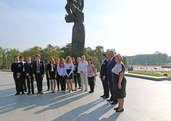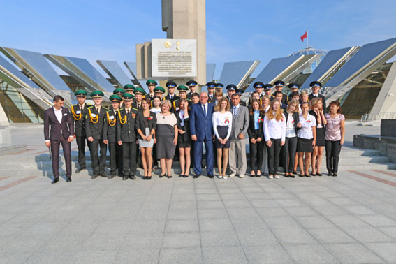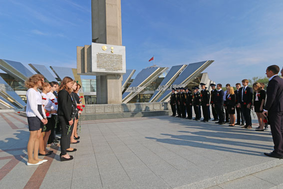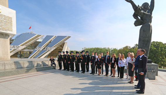 После этого учащиеся и гости открытого урока почтили память погибших в годы Великой Отечественной минутой молчания и возложили цветы к стеле «Минск – город-герой».