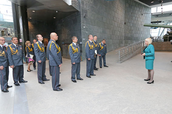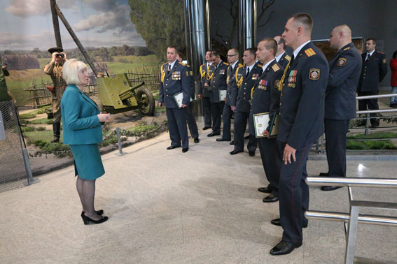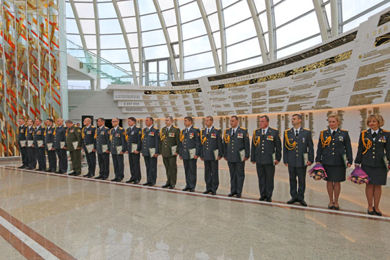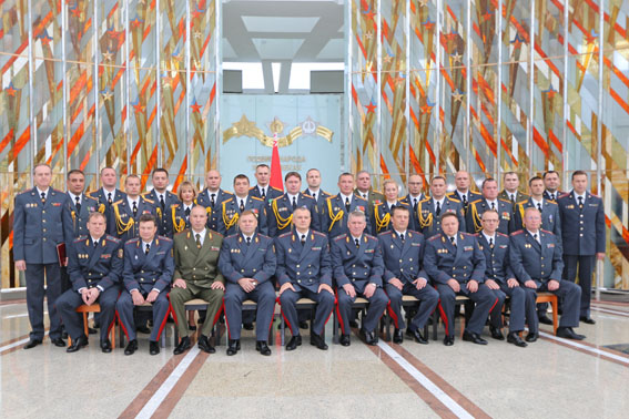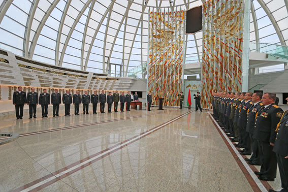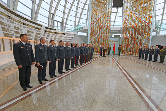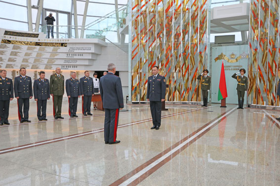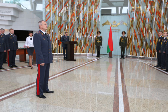 Погоны вручил Министр внутренних дел Республики Беларусь генерал-лейтенант милиции Игорь Анатольевич Шуневич. Поздравляя офицеров с присвоением воинских и специальных званий полковник, глава ведомства МВД, отметил важность и символичность проведения данного мероприятия именно в Белорусском государственном музее истории Великой Отечественной войны. «Проводя этот торжественный ритуал в Зале Победы музея, – отметил Министр, – мы тем самым отдаем дань уважения героическому прошлому белорусского народа, сотрудникам органов внутренних дел, проявившим отвагу и героизм в годы Великой Отечественной войны. Это событие наглядно демонстрирует сопричастность к истории нашего независимого государства, к истории белорусской милиции, которой в 2017 году исполняется 100 лет».