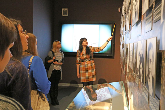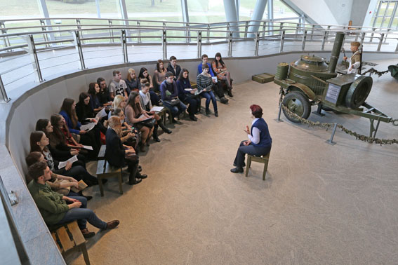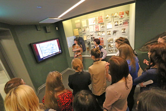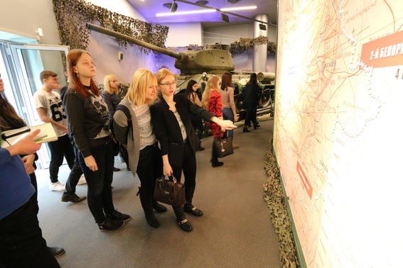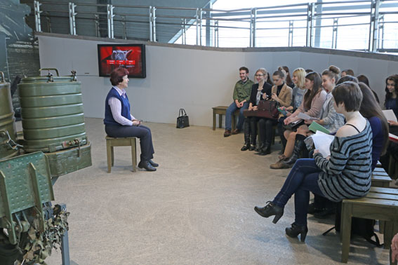 На занятии юноши и девушки вуза наглядно убедились в том, что экспозиция музея оснащена разнообразными аудио- и видеосредствами для демонстрации голосов, шумов, музыки, видеоматериалов, изображений подлинных документов и справочных материалов. А текстовая информация, заключенная в инфотерминалы, значительно дополняет необходимые сведения о событиях и об участниках Великой Отечественной войны.
