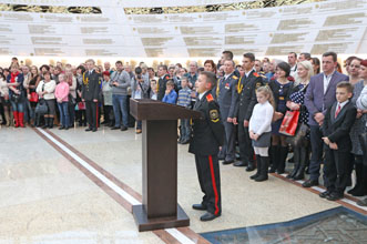 С важным событием учащихся специализированного лицея МВД поздравили: Заместитель Министра внутренних дел Республики Беларусь – командующий внутренними войсками генерал-майор Юрий Хадимуратович Караев, ветеран МВД генерал-майор милиции запаса Виктор Валентинович Жибуртович, председатель Белорусского союза суворовцев и кадет полковник запаса Сергей Васильевич Житихин, мать лицеиста-первокурсника Светлана Александровна Марченко, священнослужитель отец Дмитрий.