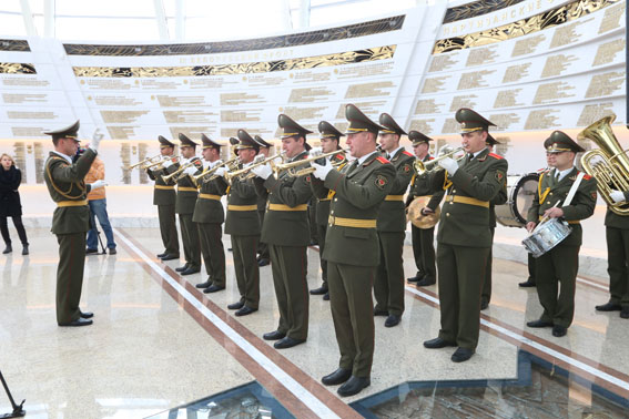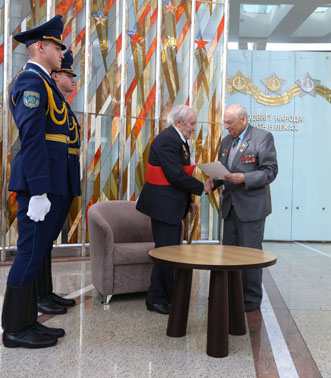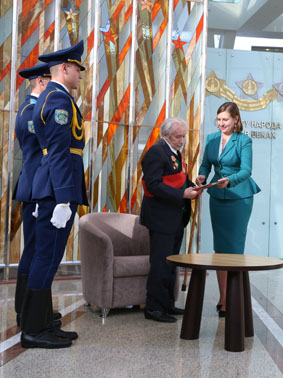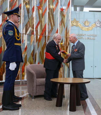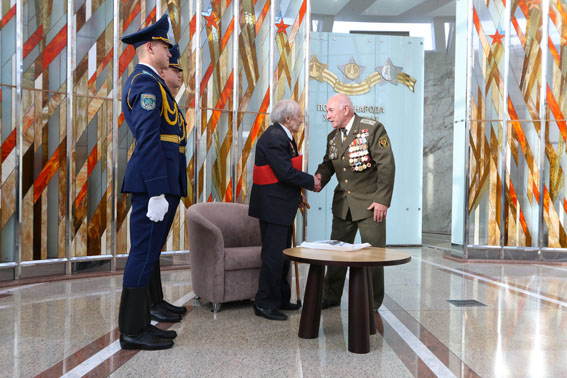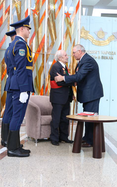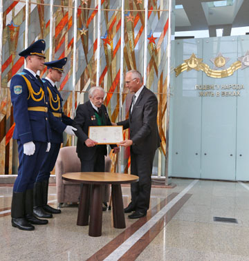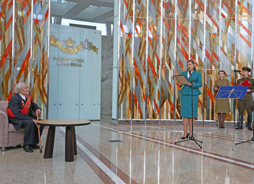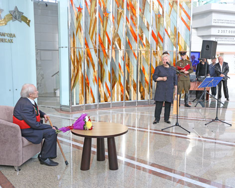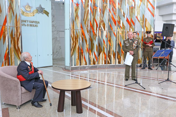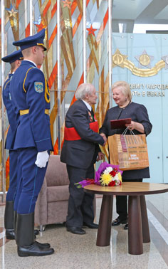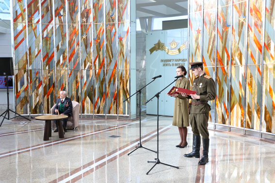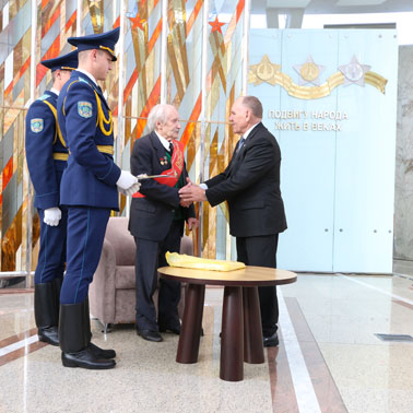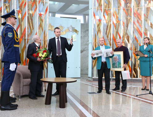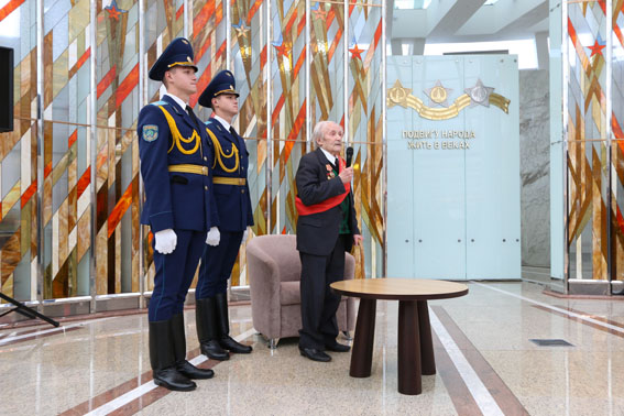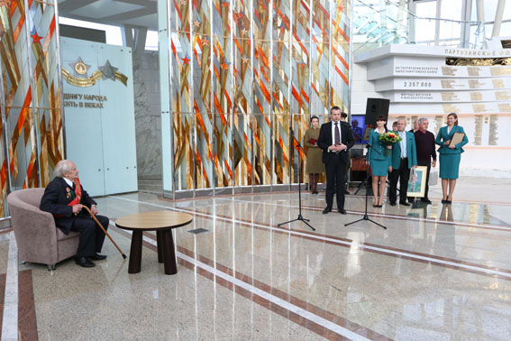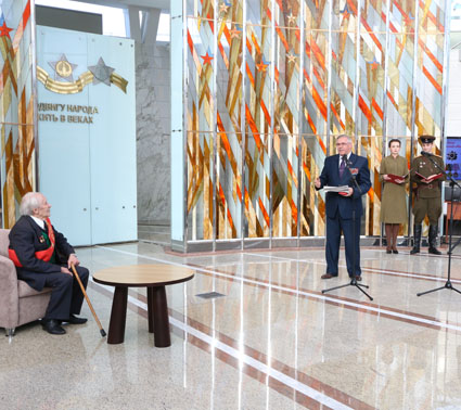Ведущие церемонии в форме военных лет – научные сотрудники Юлия Колтович и Макар Кучук – под фанфару военного оркестра «Слушайте все!» пригласили на торжество заслуженного ветерана, чьи заслуги высоко оценило государство, наградив орденами Отечественной войны II степени, Красной Звезды, Трудового Красного Знамени, Знак Почета и многими медалями СССР и Республики Беларусь.