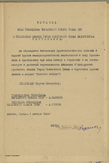 За образцовое выполнение правительственных заданий в борьбе против немецко-фашистских захватчиков в тылу противника и проявленную при этом отвагу и героизм, за особые заслуги в развитии партизанского движения в Беларуси 1 января 1944 г. С.И. Сикорскому присвоено звание Героя Советского Союза. Также он был награжден орденами Ленина, Красного Знамени, Суворова II ст., Отечественной войны I ст.