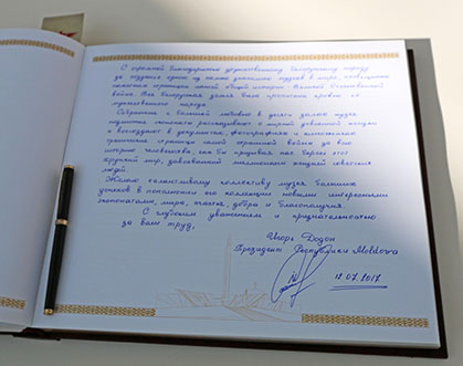 Президент Республики Молдовы Игорь Николаевич Додон оставил запись в Книге почетных гостей: «С огромной благодарностью дружественному белорусскому народу за создание одного из самых значимых музеев в мире, посвященных памятным страницам нашей общей истории – Великой Отечественной войне… Желаю талантливому коллективу музея больших успехов в пополнении его коллекций новыми интересными экспонатами, мира, счастья, добра и благополучия…».