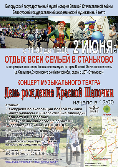 В самом начале лета, 2 июня, с 11.00 до 16.00, в необыкновенно живописном месте – у деревни Станьково Дзержинского района Минской области (рядом с ЦЭТ «Станьково»), на территории экспозиции боевой техники и тяжелого вооружения Белорусского государственного музея истории Великой Отечественной войны, состоится БОЛЬШОЙ ПРАЗДНИК ДЛЯ ВСЕЙ СЕМЬИ. Сотрудники Белорусского государственного музея истории Великой Отечественной войны и артисты Белорусского государственного академического музыкального театра представят большую культурно-развлекательную программу «ОТДЫХ ВСЕЙ СЕМЬЕЙ В СТАНЬКОВО», приуроченную к Международному дню защиты детей.
