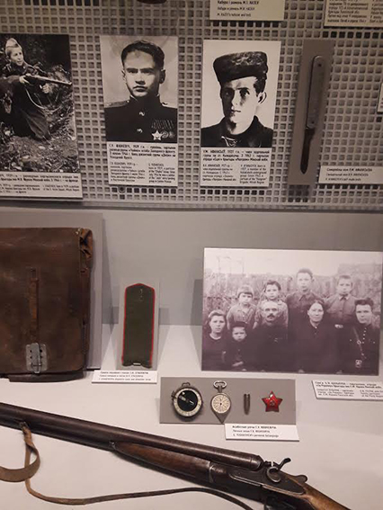 Посетители нашего музея смогут увидеть в экспозиции предметы, преданные в дар Геннадием Владимировичем Юшкевичем. Среди них: звездочка – первая награда от командира группы «Чайка» Михаила Ильича Минакова, которую тот снял со своей шапки и вручил юноше за проявленную храбрость; курвиметр, взятый в качестве трофея в бою возле д. Валерьяны на шоссе Слуцк-Минск зимой 1944 г.; компас погибшего в бою командира группы «Джек» Павла Андреевича Крылатых; патрон, оставленный на память после боя в августе 1944 года на территории Восточной Пруссии. Каждый из этих экспонатов отражает определенный этап жизни в годы Великой Отечественной войны юного разведчика Геннадия Юшкевича.