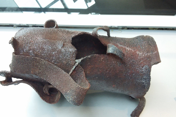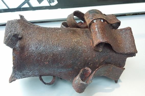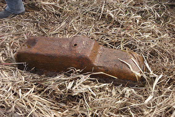 Поврежденные взрывом реактивная камера и лопасть стабилизатора реактивного снаряда РС-132. Березинский район.