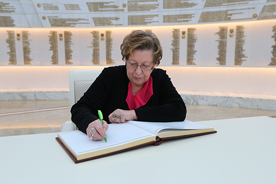 Н.П. Машерова оставляет запись в Книге отзывов почетных посетителей.