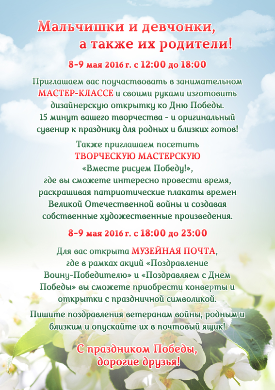 | 18.00-23.00 | Акция «Поздравления Воину-Победителю». Отправление посетителями музея открыток ветеранам войны |