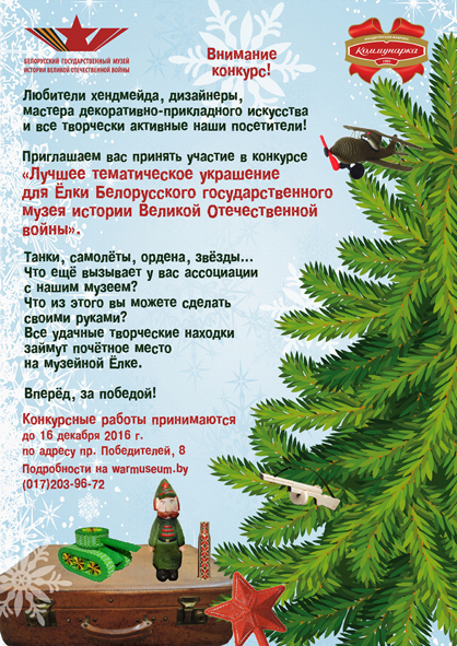Приближается Новый год, а значит, наступает время для создания праздничного настроения и воплощения творческих замыслов. Мы предлагаем вам свою площадку для креатива – в рамках конкурса «Лучшее тематическое украшение для Ёлки Белорусского государственного музея истории Великой Отечественной войны».Мы убеждены, что новогодняя ёлка, перед которой мы благоговеем с самого детства, – не просто элемент праздничного декора. Это то, что обладает чудесными способностями: мирить и сплачивать, утешать и защищать.