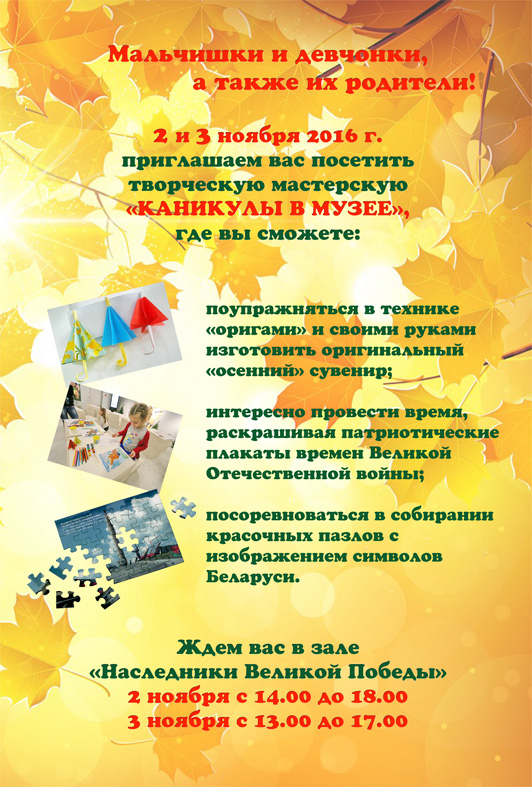 а также их родители! 2 и 3 ноября 2016 г. приглашаем вас посетить «КАНИКУЛЫ В МУЗЕЕ», где вы сможете: