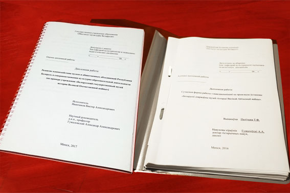 Дипломную работу по теме «Развитие взаимодействия музеев и общественных объединений Республики Беларусь в совершенствовании культурно-образовательной деятельности на примере учреждения "Белорусский государственный музей истории Великой Отечественной войны"» успешно защитил В.А. Иванчиков. В отзыве на дипломную работу доктор исторических наук, профессор А.А. Гужаловский отметил: «Исследование, проведенное слушателем В.А. Иванчиковым, представляет интерес с нескольких точек зрения: во-первых, с точки зрения обогащения сведений о музейной деятельности в Республике Беларусь; во-вторых, с точки зрения оценки вклада автора в изучение общественных связей музея; в-третьих, рассказ о мероприятиях в музее ведется в тесной связи с социально-культурным развитием страны. Дипломная работа – это итог большого и кропотливого труда, который заслуживает отличной оценки».