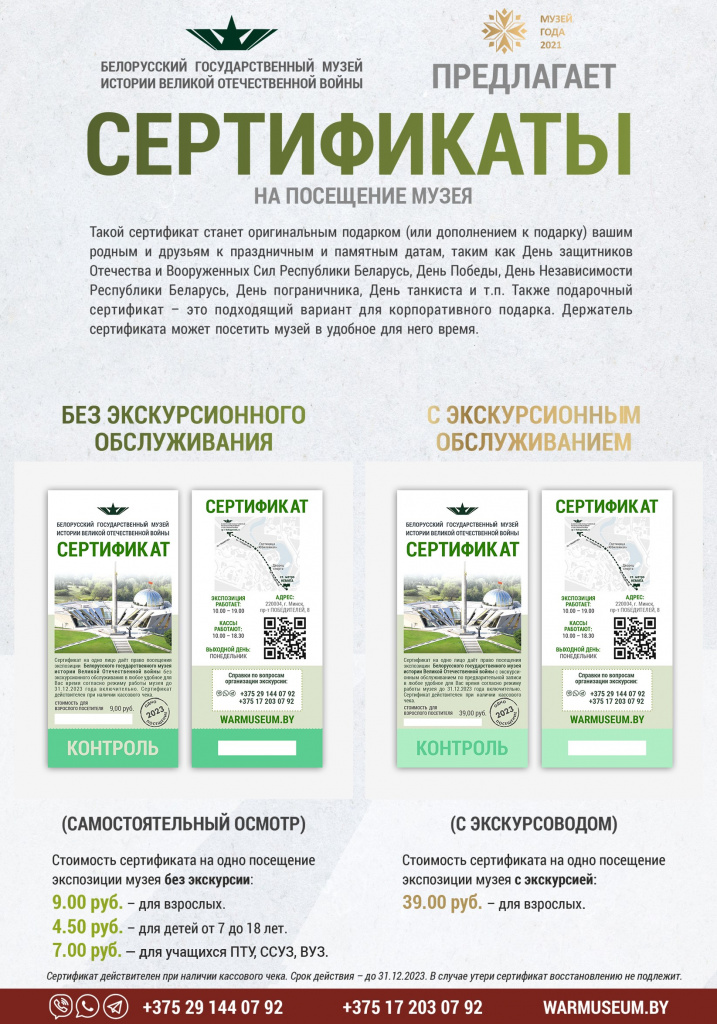 Белорусский государственный музей истории Великой Отечественной войны выпустил в продажу Сертификаты на посещение экспозиции в двух вариантах – с экскурсионным обслуживанием и без него (самостоятельный осмотр).